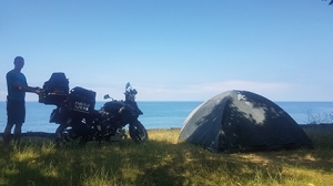 Everything was written in kartuli anbani, the Georgian alphabet. We were glad that there were also Latin words beside it. On the border, we met Raif, a nice and helpful guy driving a Yamaha Teneré on his way to Tajikistan. He helped us with translation while buying insurance for the bikes. After saying goodbye, we went on to Batumi, a beautiful city on the Black Sea. As we drove along the coast the view was amazing. The city was bathed in the warm afternoon light and the sea was glittering from orange to pink in the colors of the sunset. We decided to take a break and enjoy the breathtaking scenery as well as take a few pictures. The owner of a nice restaurant on the seaside allowed us to use his terrace to take some pictures. We went on north out of Batumi to find an idyllic camping site called Robi, directly on the sea, where we pitched our tent in the last light of the day for the amazing price of 10 GEL per night for both of us. We spent the next day swimming, relaxing in the shadows and using the Wi-Fi. The other guests were a family from Belarus and some Russian people, as well as two cute dogs that didn`t really belong to anyone but felt at home on the campsite. They were looking for human closeness and nearly attacked Peter until he started stroking them. Good that we are vaccinated against every possible disease.