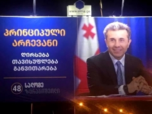 The new election posters and banners of the ruling Georgian Dream (GD) backed candidate, Salome Zurabishvili, show Founder and Chair of the ruling Georgian Dream, Bidzina Ivanishvili, with the new slogan:”Principal Choice: freedom, development and dignity.”