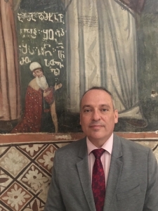 Photo: The Ambassador standing before the only known portrait of Shota Rustaveli, Georgia's national poet, at Jerusalem's 11th century Monastery of the Cross