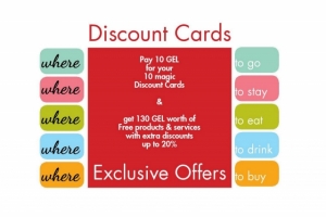 *WHERE Discount Cards – Buy 10 magic discount cards for only 10 GEL (1 GEL per card) and enjoy 130 GEL worth of free gifts and extra discounts up to 20% from locales.