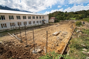 But the big moment came when they began working on a smaller area inside the grounds. More cement and posts, all carefully lined up with string, in a neat rectangle. Suddenly their intent became clear, a copy of all those Saakashvili-era constructions which sprang up all over Georgia in apartment courtyards, schoolyards and village squares: a sports stadium of Etseri's very own!