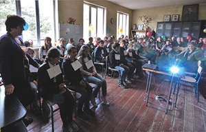 We recently hosted the winners of local English spelling bees from eight village schools in Upper Svaneti for the regional finals. This whole thing had been organized by my dear wife a couple of months in advance, to allow time for those locals and this wrap-up. She stipulated two groups, grades five through eight, and nine through twelve, but all were to study the words from the English World level two book. She put them into alphabetically ordered sets by last name, so that my word list would be completely fair as I had no knowledge of their order until they had all gathered.