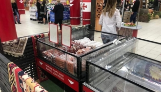 Carrefour shocked customers at its Tbilisi Mall branch yesterday by displaying a live piglet next to the stand of a Georgian brand selling pork products...