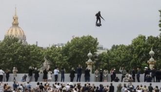 A 'Flying Man' over Champs-Elysées at Bastille Day celebration